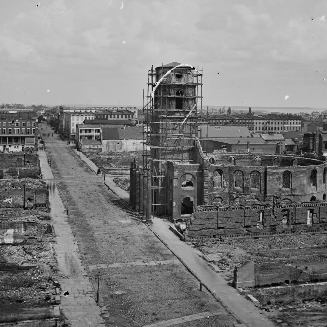 Bird’s eye view of the damage the great fire of 1861 and the war brought to Charleston, you can see the colorized photo was taken by the first pillar of the church. Only the harbour area was reduced to rubble, fortunately most of the city survived the war.